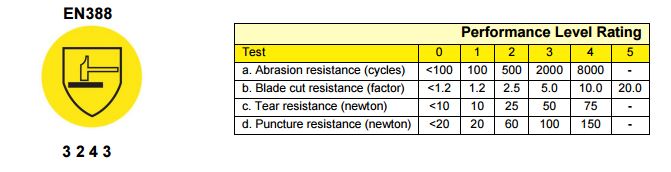 La norme EN388:2003 évalue les gants sur leur capacité à résister aux risques mécaniques :