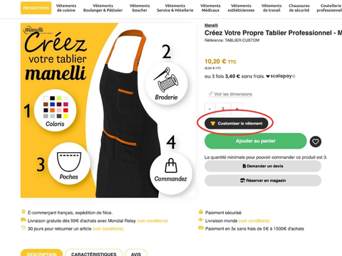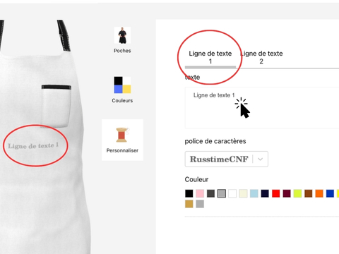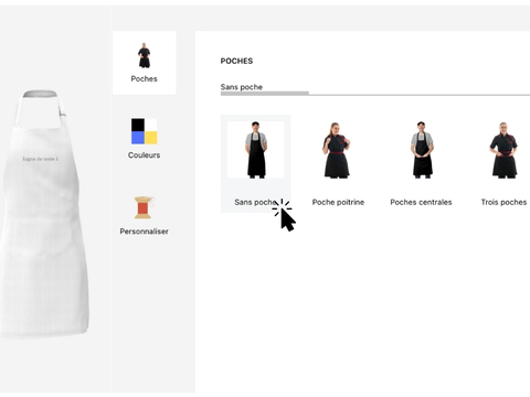 Pour débuter la personnalisation de votre tablier, veuillez cliquer sur l'option "customisez le vêtement". Vous serez alors dirigé vers notre module de personnalisation, où nous procéderons étape par étape pour concevoir votre tablier idéal.