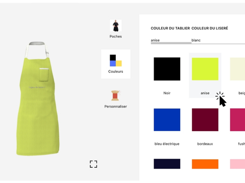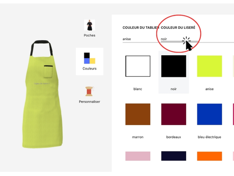 Couleur du liseré : cliquez sur "couleur du liseré", vous aurez accès à la même palette de couleurs que celle proposée pour le tablier. De la même manière, sélectionnez la couleur qui vous convient.