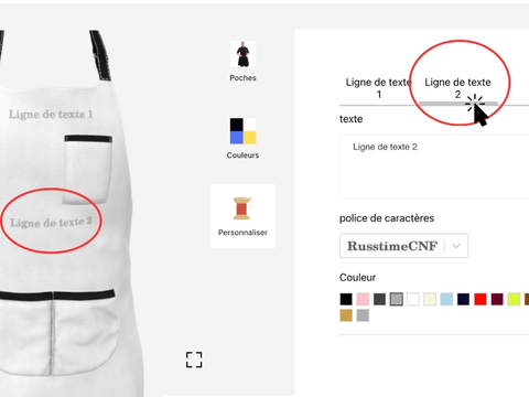 Selon votre choix de poches (sans poche, une ou deux poches), vous pouvez ajouter une ligne de texte personnalisé en modifiant le texte prédéfini.
