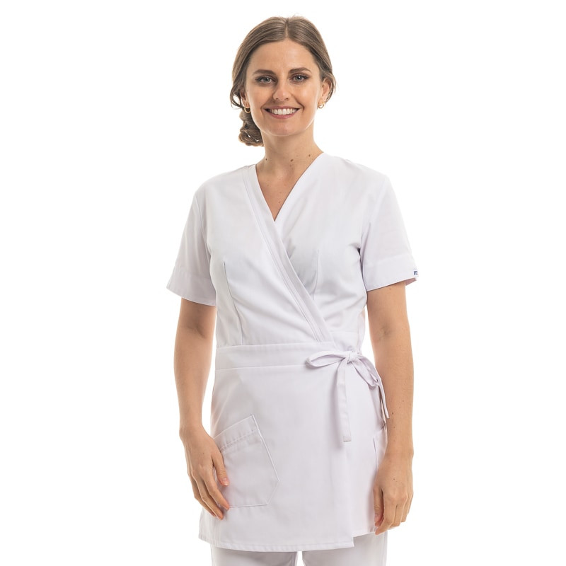 Porter cette blouse esthéticienne femme blanche pour les soins en institut, spa ou activités de bien-être