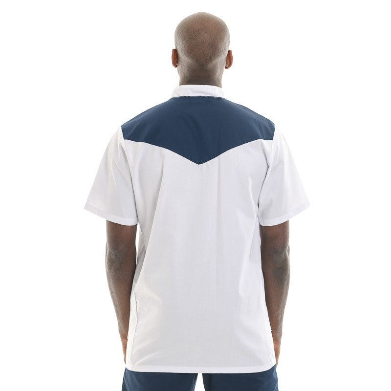 Discover this men's white medical scrub top with navy blue details, named Sasha. It's perfectly suited for hospital staff. Made from breathable materials , it provides long-lasting comfort.