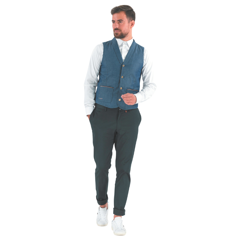 THEArago Men's Denim Blue VestofLAFONT SERVICEis aelegant and modern piece, ideal forbartenders, waiters and service professionalslooking foran outfit that is both comfortable and trendyHispremium compositionincotton, viscose, polyester and elastaneconfersa soft and comfortable texturewhile offeringexcellent freedom of movement. Herdenim-effect fabricand itsstructured crew neckaddan original and sophisticated touchto your work attire.